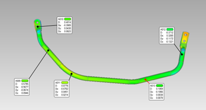 此次的數(shù)據(jù)測量,讓客戶獲取了汽車彎管精準的三維數(shù)據(jù),然后對照原有圖紙數(shù)據(jù),快速得到偏差值,方便其進行修正。同時,根據(jù)彎管精確的三維數(shù)據(jù),也可應(yīng)用于彎管的逆向設(shè)計,二次開發(fā)。