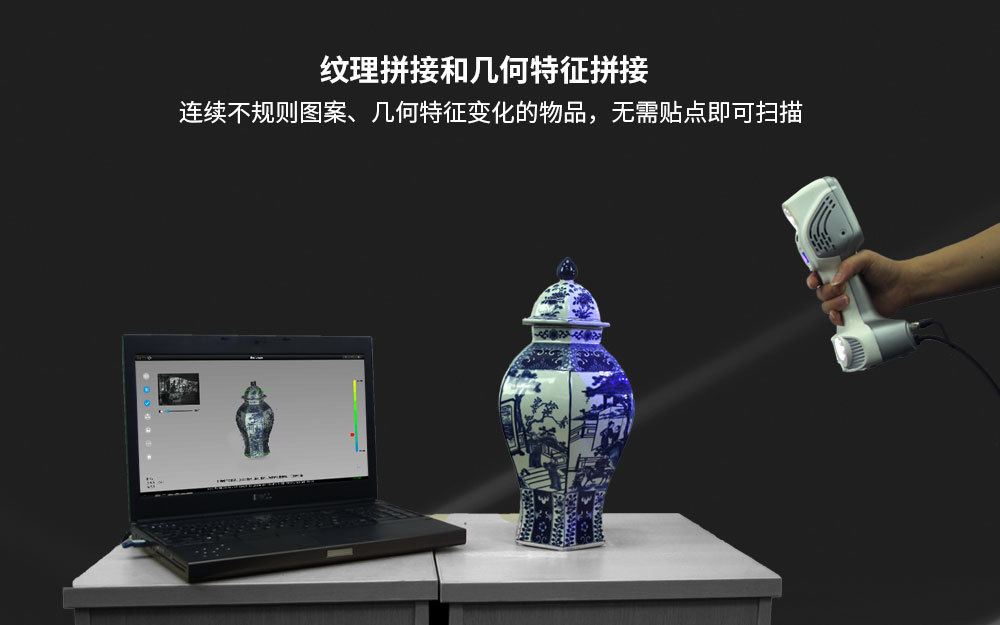 強(qiáng)大的拼接能力:擁有先進(jìn)的紋理拼接和幾何特征拼接算法,當(dāng)用戶遇到連續(xù)不規(guī)則的圖案/幾何特征變化的物品時,無需貼點(diǎn)即可完成掃描。當(dāng)遇到復(fù)雜特征物品時(存在無特征區(qū)域易于拼錯),使用混合拼接(將紋理、特征、標(biāo)記點(diǎn)拼接智能地融合在一起),只需貼少量標(biāo)記點(diǎn)即可完成掃描。